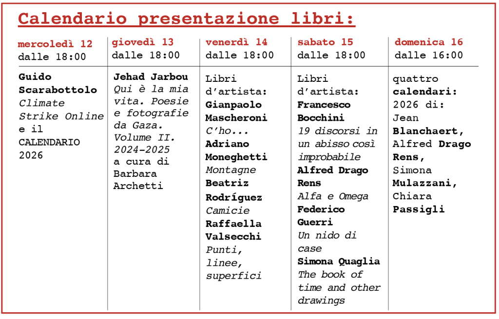Quest’anno si comincia con la ventisettesima edizione del calendario di Guido Scarabottolo e un suo piccolo libro di protesta, Climate Strike Online; poi, a un anno di distanza dal primo, il secondo volume di poesie e fotografie di Jehad Jarbou dalla striscia di Gaza. Per la prima volta presentiamo libri d’artista, qualcuno in originale copia unica, altri multipli, uno, di 500 pagine, stampato. E poi i calendari 2026, Edizioni della Galleria, e la mostra diffusa e confusa degli artisti invitati.